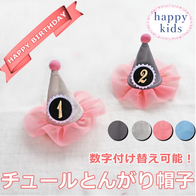 ベビーキッズ用 チュールとんがり帽子 ヘアクリップ グレー×ピンク 誕生日 バースデー ヘアピン ヘアアクセサリー クラウン 犬 ペット