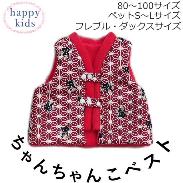 ちゃんちゃんこベスト 麻の葉 黒猫 レッド ベビー 赤ちゃん キッズ 子供 男の子 女の子 秋冬 犬 猫 ペット