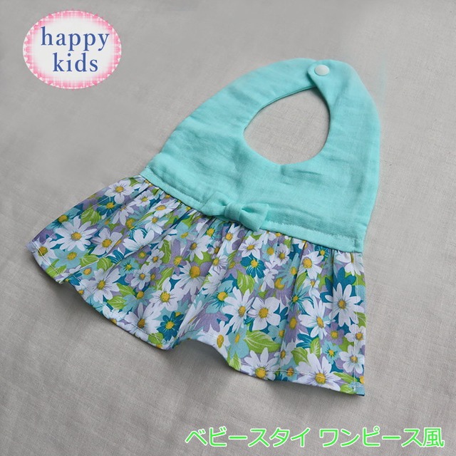 ワンピース風スタイ よだれかけ ミント×花柄 リボン付き ベビー 赤ちゃん キッズ 子供 幼児 女の子